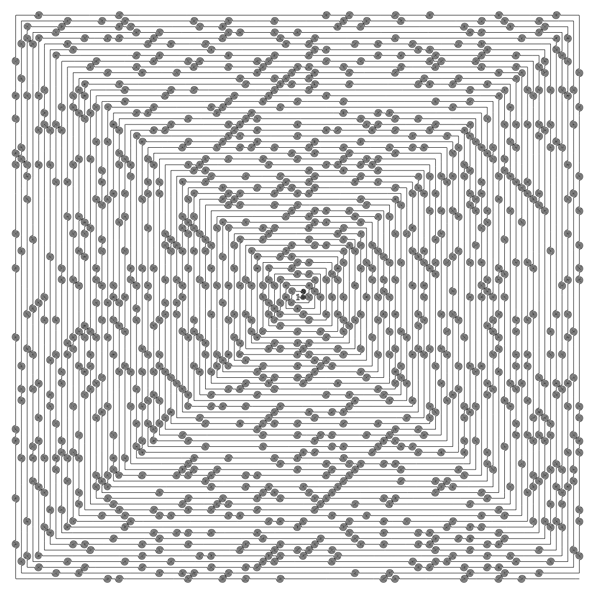 Nina suggested representing each prime number by an in-and-out spiral, which looks cool, and should lay down enough thread to make the primes stand out. This pattern should stitch quite fast, because it's got a lot of straight lines in it.